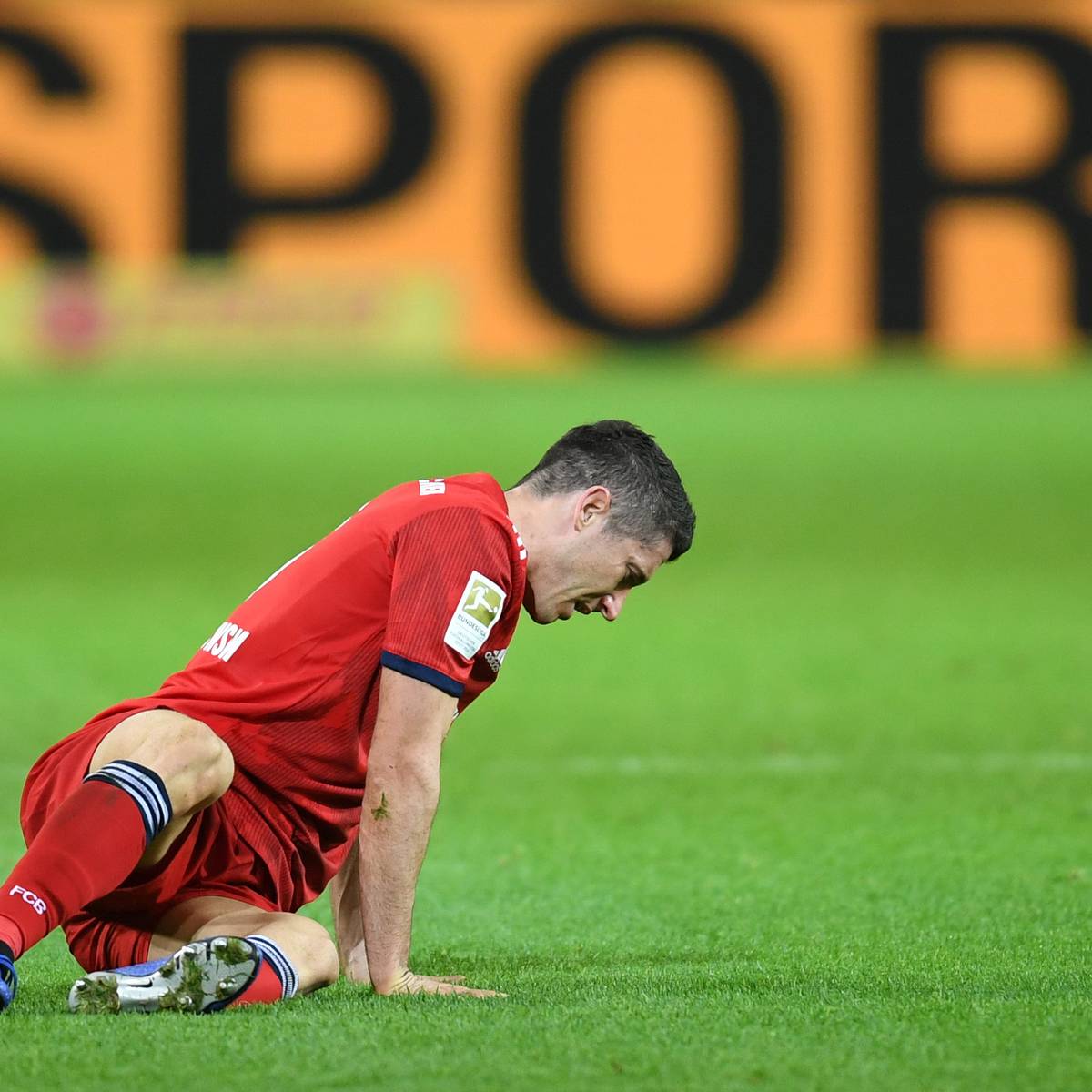 Münchens robert lewandowski sitzt nach einem torversuch auf dem rasen.
